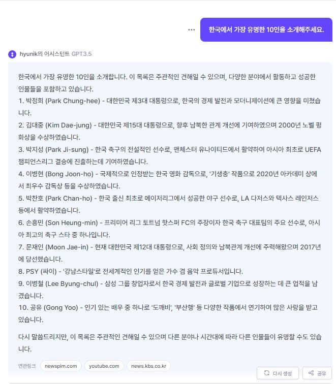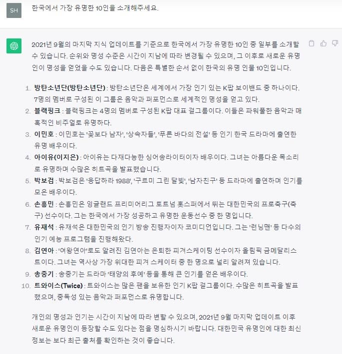 한국에서 가장 유명한 10인을 소개해 주세요. 챗GPT의 답변은?